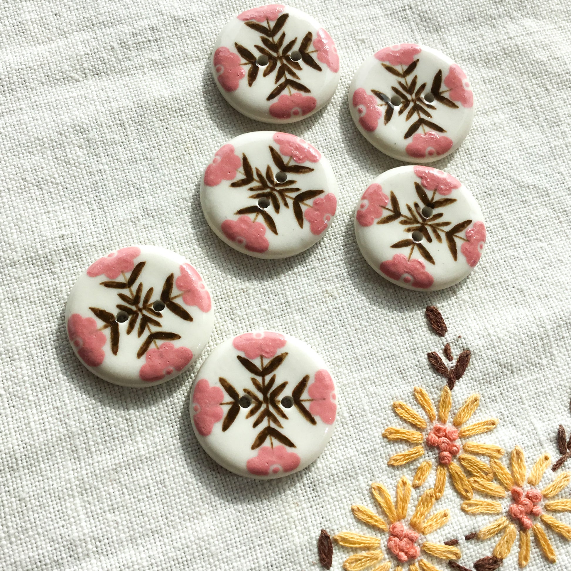 These unique, hand-painted porcelain buttons have a pretty floral design that would complement any garment.