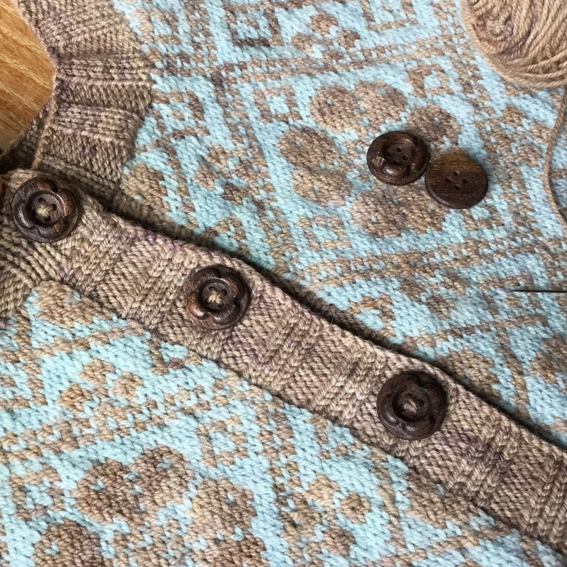 The sweater pattern shown in the photo is the Marigold Cardigan by Mona Zillah