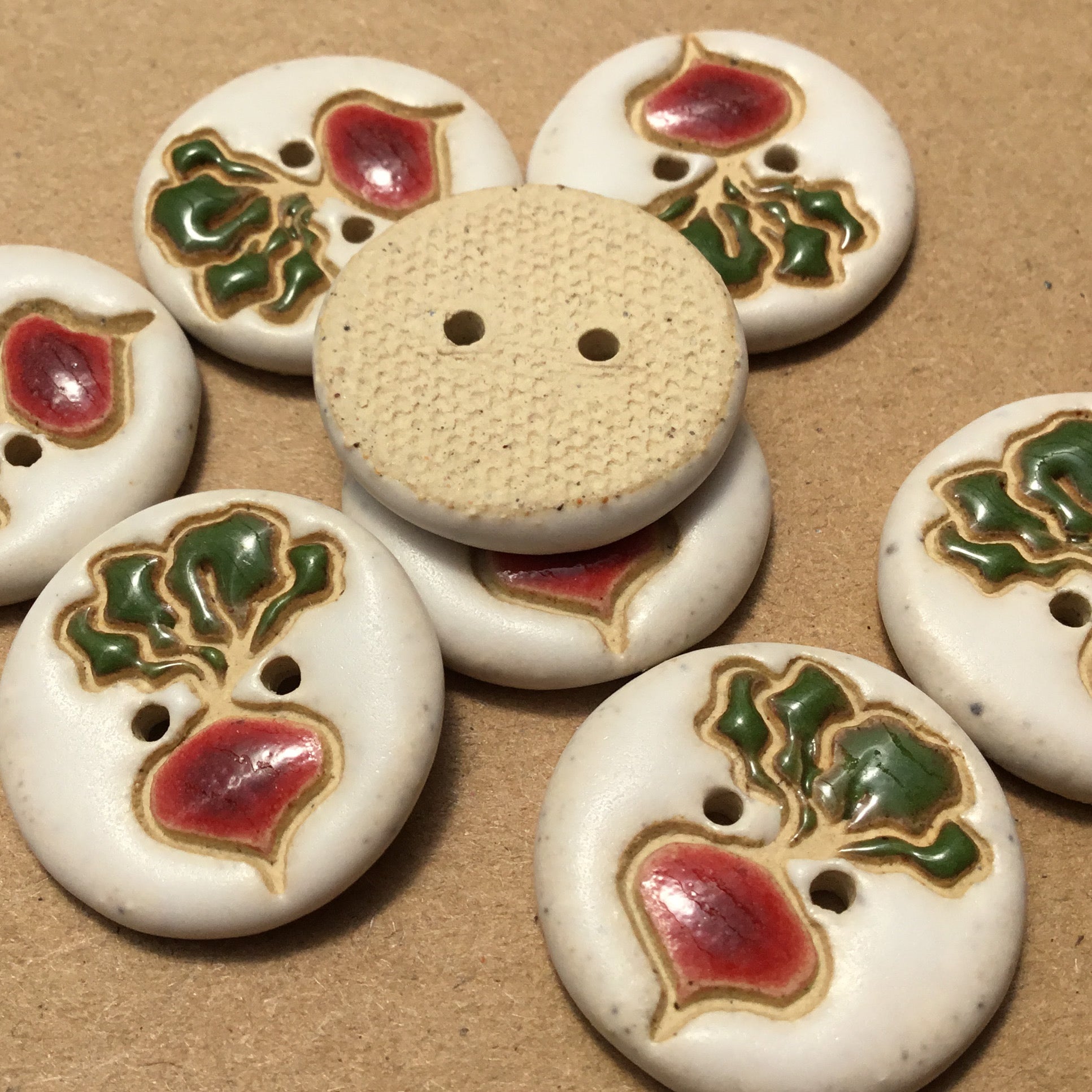 These Garden Beet Buttons are perfect for adding a unique, rustic touch to handmade clothing. Made from stoneware with a matte finish, they'll provide an earthy charm to your creations.